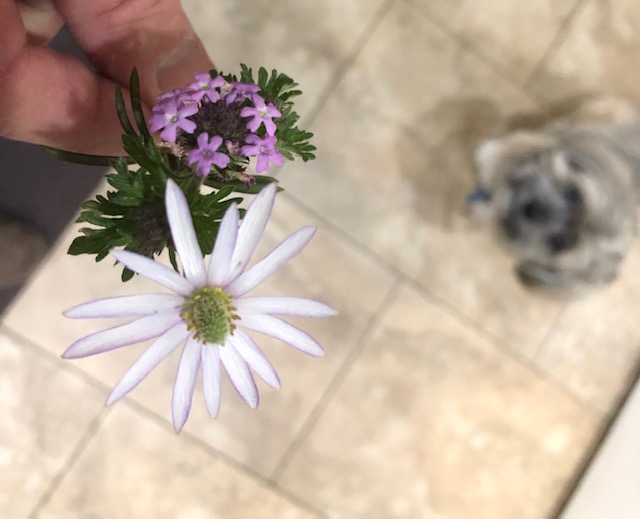 Michael does what he can to lighten my mood and lessen my worries. Today he brought me in the cutest little bouquet from whatever was blooming in our yard. I have no idea what these little gems are–doesn’t matter to me–to me it helped me see someone I love was thinking about me.
